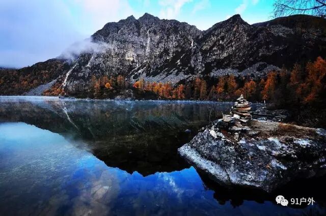 雾气散去的时候可以在湖面看到清晰的雪山、树林倒影以及那颜色变幻莫测的湖水